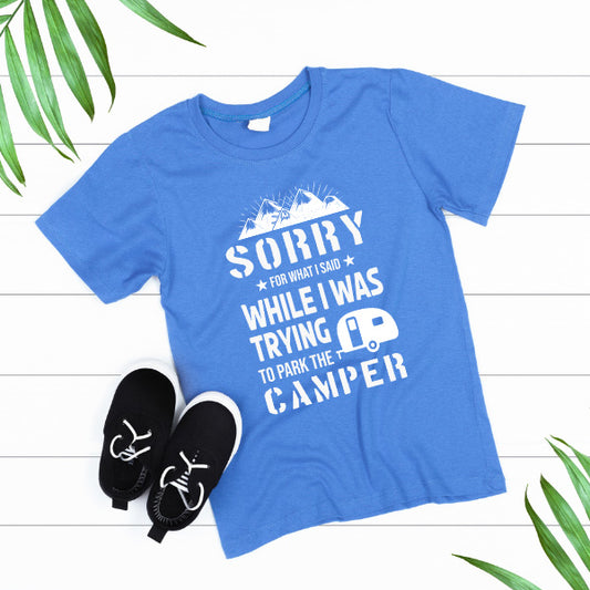Sorry For What I Said Trying To Park The Camper – Unisex Graphic Tee | Perfect for Camping Adventures
