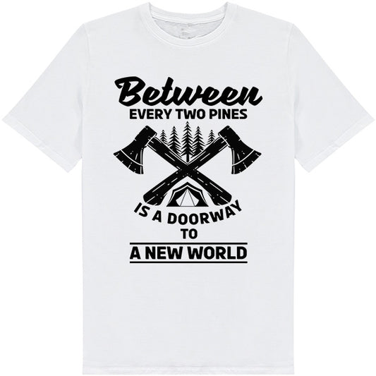 Between Every Two Pines Is A Doorway To A New World – Unisex Graphic Tee | Perfect for Camping Adventures